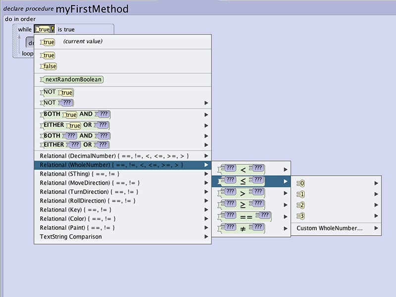 This Lesson is intended to be a short presentation on relational expressions that can be used in conjunction with other lessons. Alice allows you to construct relational expressions to expand the complexity of places where you can make use of boolean data types. Their use is most prominently referenced in the lessons on control structures and loops and conditional blocks. This lesson could be used to help broaden the learning around the definition of relational expressions or to help broaden the understanding of how they can be used in Alice.